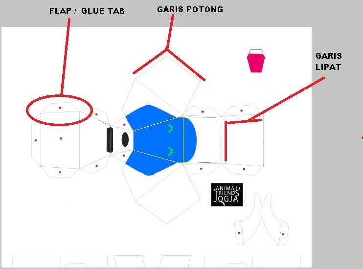 *catatan : di bagian yang berwarna biru, terdapat garis lipat yang tertutup oleh warna biru tersebut. Garis lipat ini juga harus di-scoring. Perhatikan garis kuning pada gambar perkenalan template sebelumnya.
