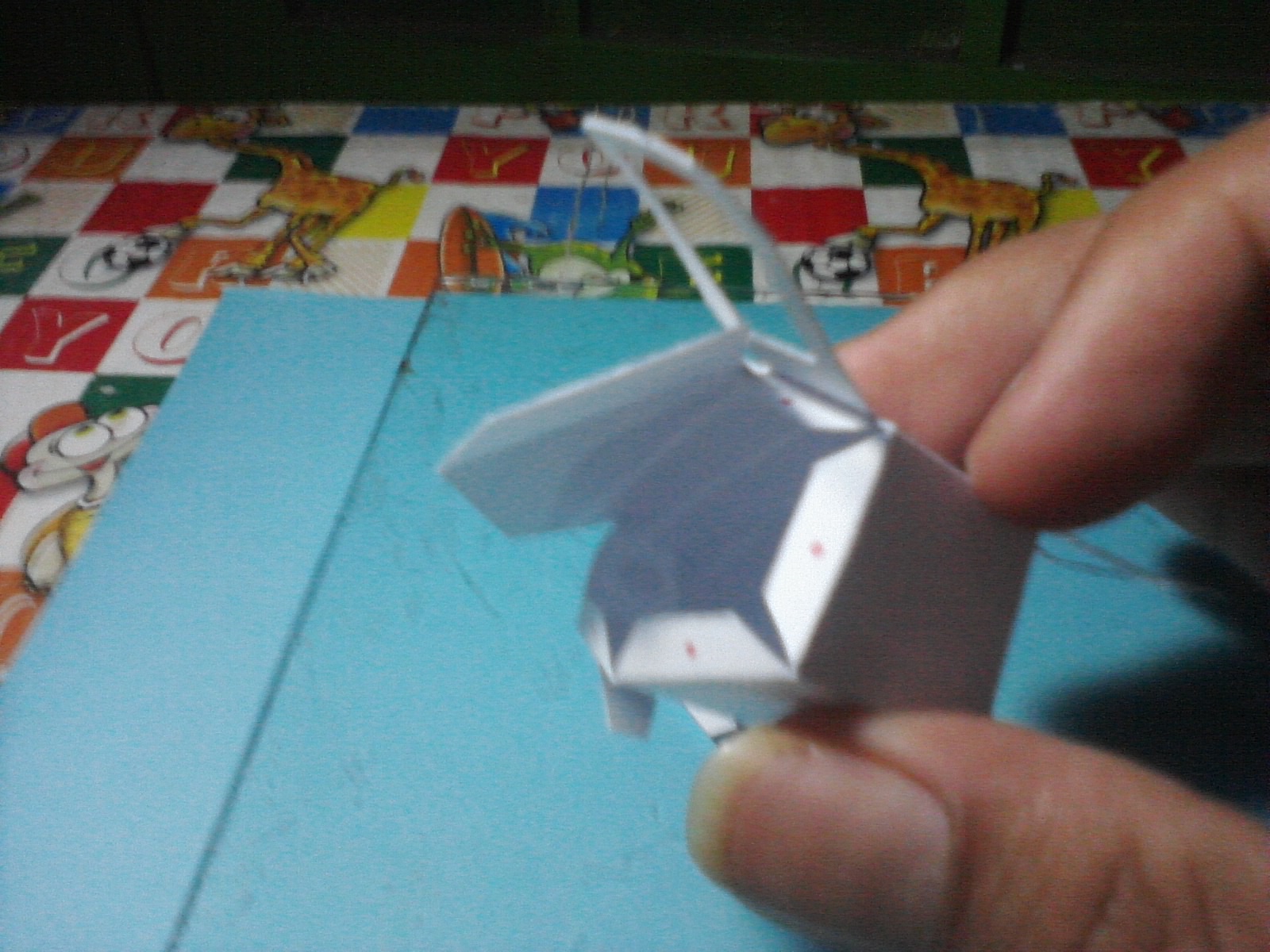 Ambil bagian badan dan ekor, lipat sesuai garis lipat.Masukkan dan rekatkan bagian ekor ke bagian badan yang sudah diiris (seperti bagian telinga dan lidah). Kemudian rekatkan flap pada posisinya masing2 sehingga diperoleh bentuk badan seperti berikut.
