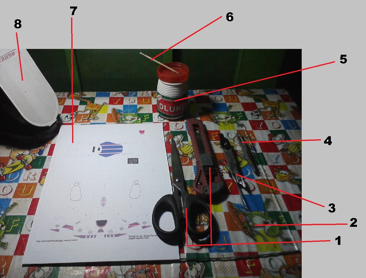 - Alat untuk memotong (gunting atau cutter). Sebagai catatan, beberapa bagian di model ini harus "diiris" menggunakan cutter.